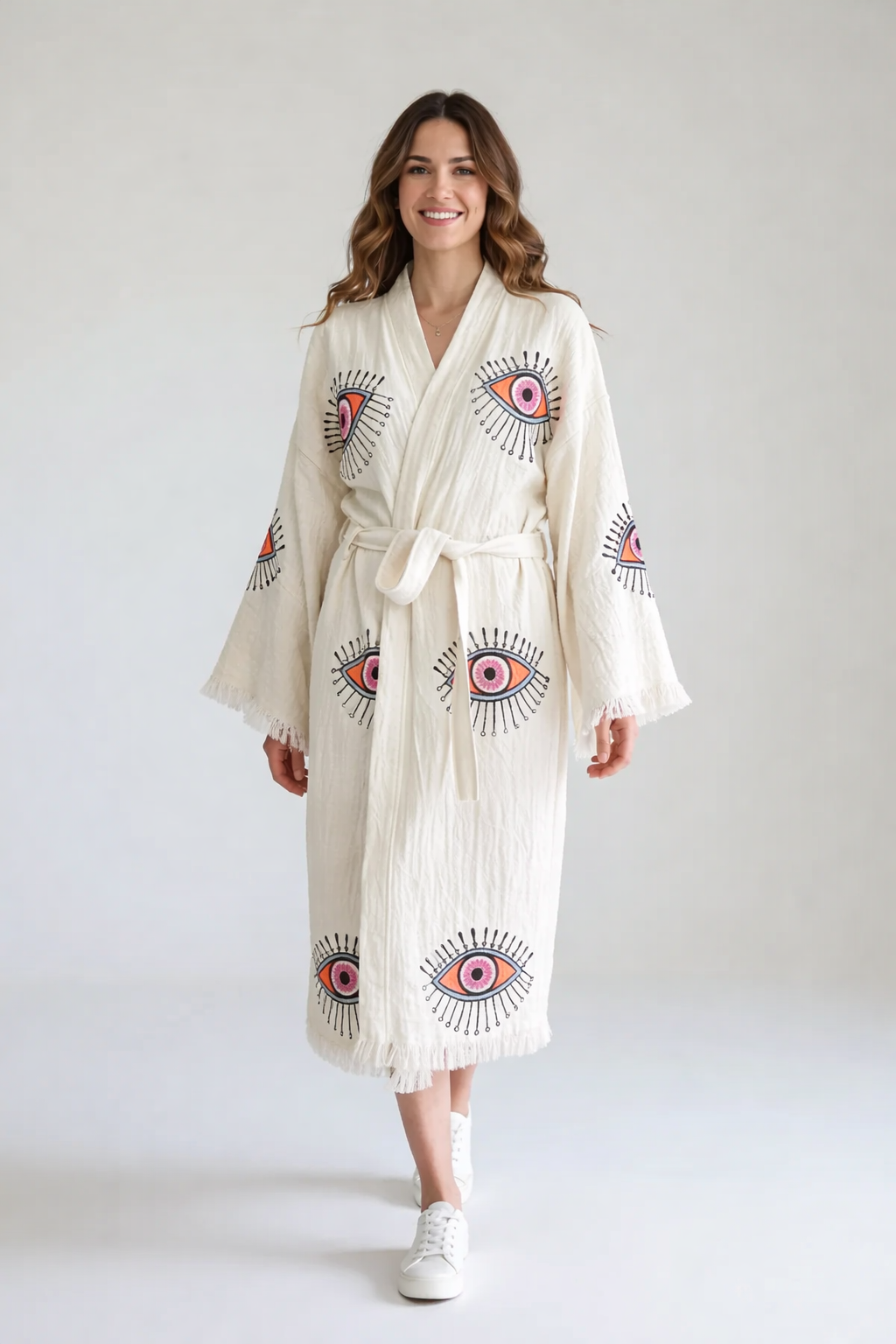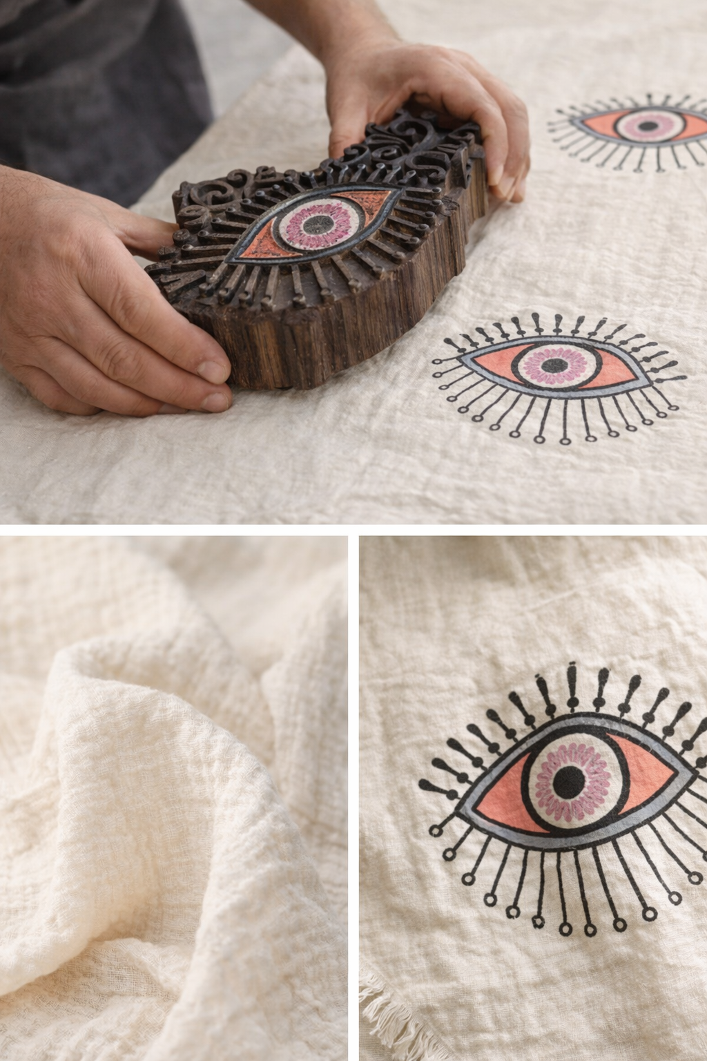 Each robe is crafted in Turkey using traditional wooden stamp techniques. The motifs are pressed onto cotton muslin fabric, creating subtle variations that give every piece its own character.