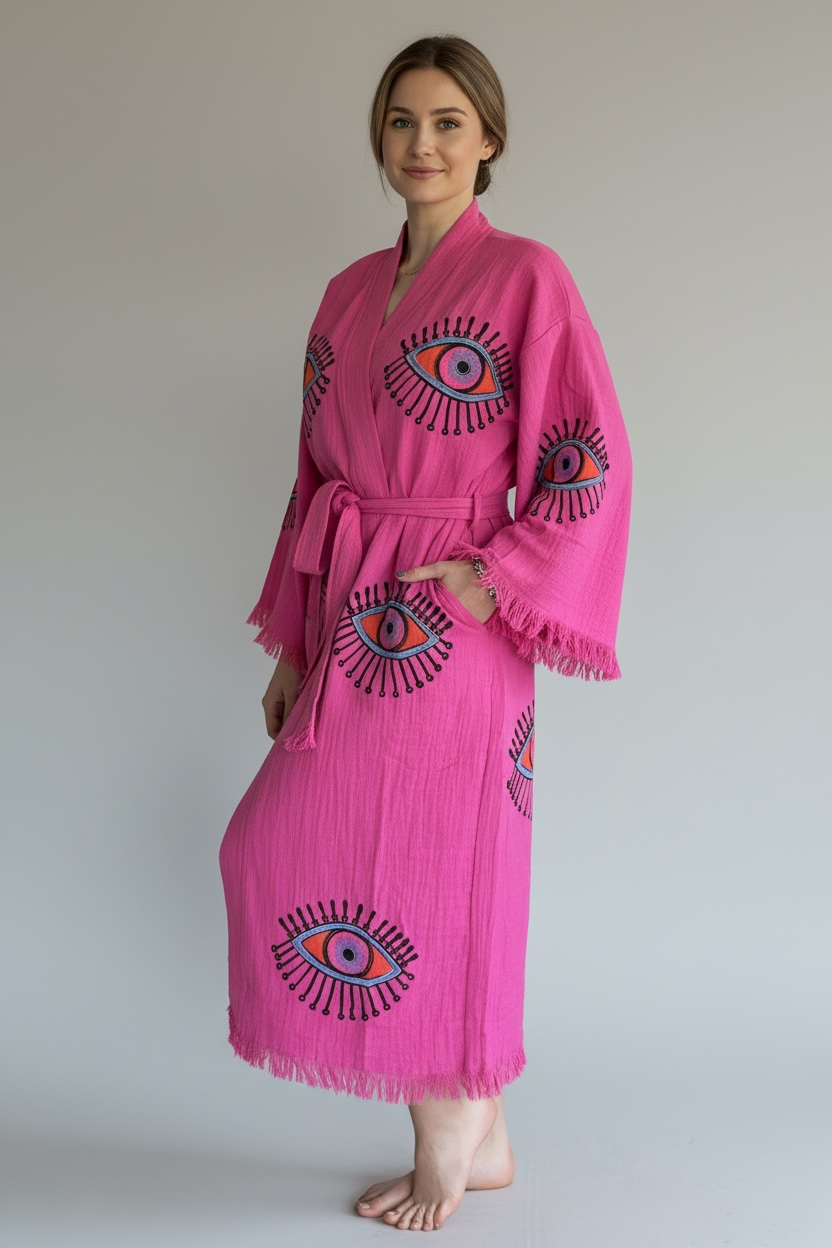 Delicate yet eye-catching, this pink kimono combines softness with bold design. Crafted from lightweight 100% cotton muslin, it offers a gentle, airy feel while maintaining durability. The evil eye design stands out beautifully against the soft pink background, offering both protection and style. Ideal for those who want a feminine yet culturally rich piece for lounging or casual wear, this kimono promises comfort and elegance in one.